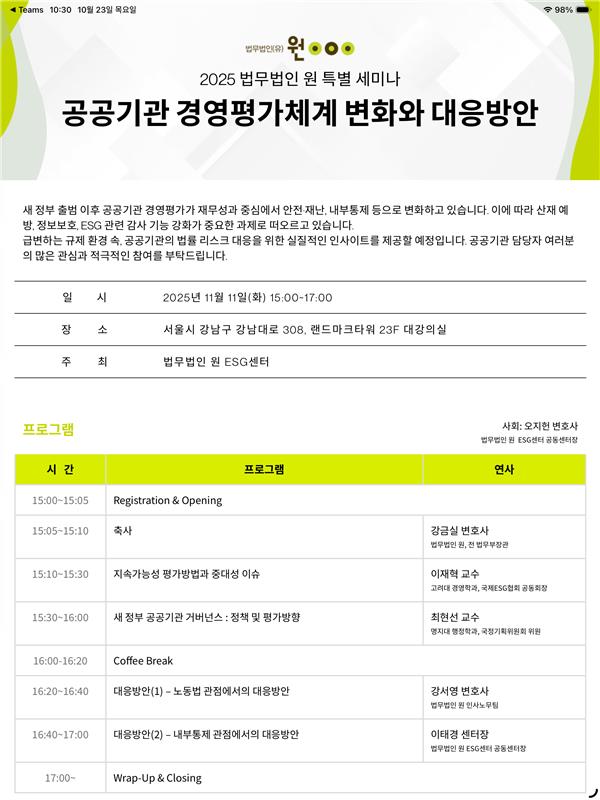 법무법인 원의 '헤리티지 원'팀 서순성 변호사와 정찬우 세무사가 뉴저지, 뉴욕, 애틀란타 교민을 대상으로 세미나를 진행합니다.자산 승계와 상속 증여 문제 해결을 위한 전문 세미나가 뉴저지와 뉴욕 그리고 애틀란타에서 한인사회 대상으로 열립니다.한국과 미국의 법률, 세무 전문가들이 참여해 국경을 넘나드는 상속과 증여 과정에서 발생할 수 있는 복잡한 문제와 분쟁 해결 방안을 종합적으로 제시합니다.◆뉴저지: 9월 29일(월) 오후 3시 ▶장소: Hyatt Place Fort Lee(2167 Rte. 4 E, Fort Lee...