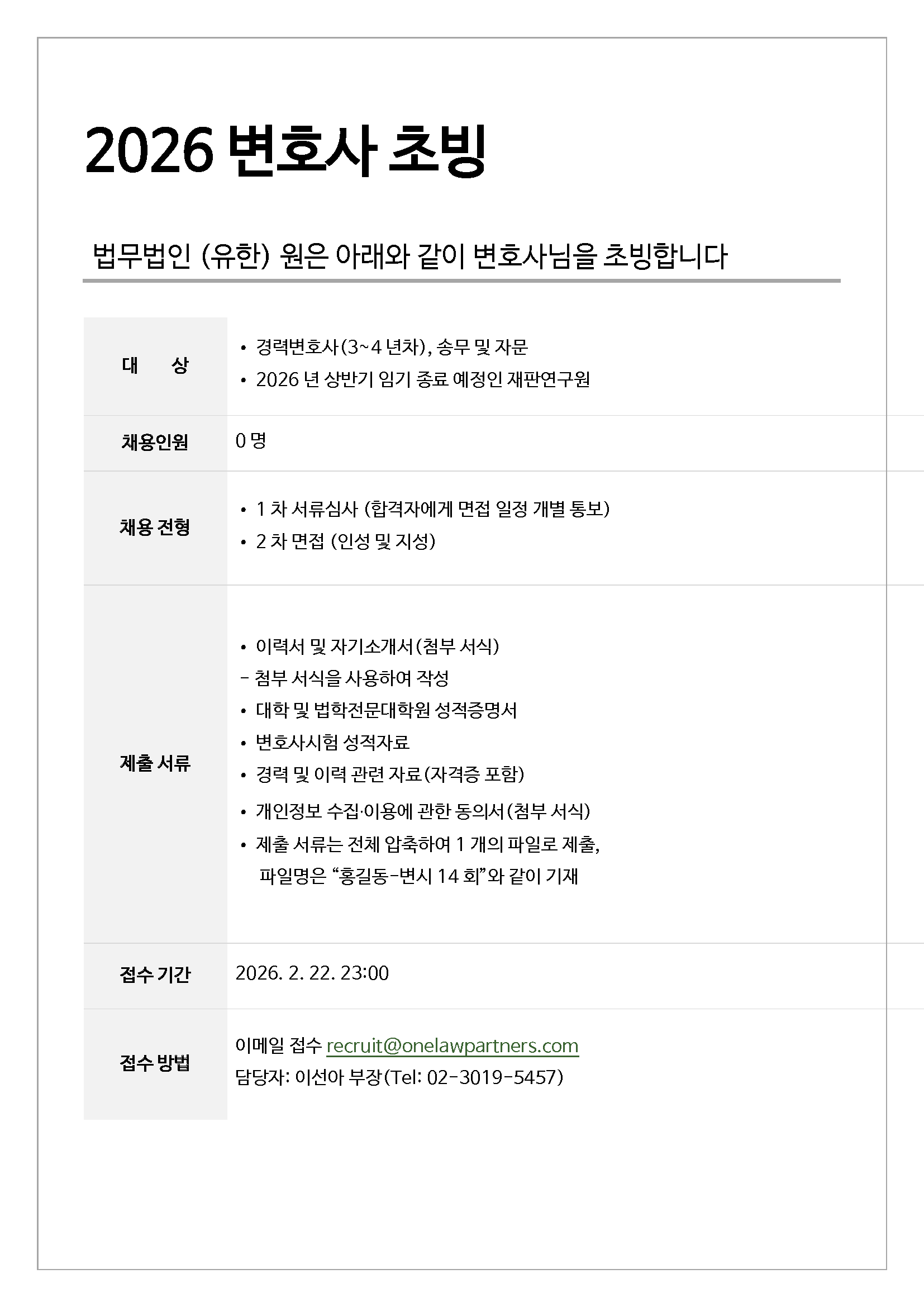 법무법인 원은 다양한 분야의 법률 전문가, 신입 및 경력 변호사, 지원자 분들의 열정과 역량을 기다립니다. 인재상, 채용중인 공고, 채용 절차, 성장 기회를 확인하세요.
